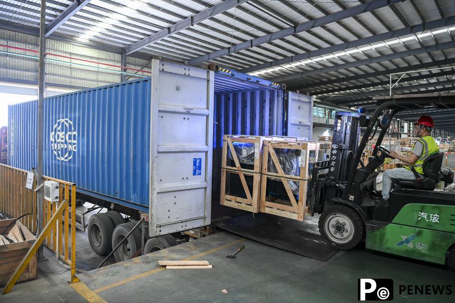 A staff member loads glass products for export into a container at an enterprise in Beihai, south China's Guangxi Zhuang Autonomous Region, March 13, 2025. (Xinhua/Cao Yiming)