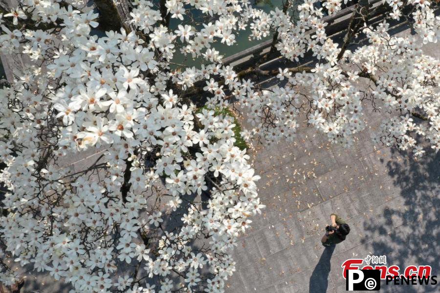 Magnolia flowers blossom at an ancient temple, adding beauty in the spring season in Hangzhou, east China's Zhejiang Province, March 11, 2025. (China News Service/Wang Gang)