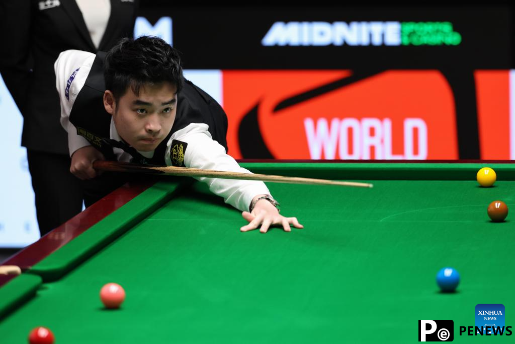 Si Jiahui of China competes during the round 1 match against David Gilbert of England at World Snooker Championship 2025 in Sheffield, Britain, April 22, 2025. (Photo by Zhai Zheng/Xinhua)