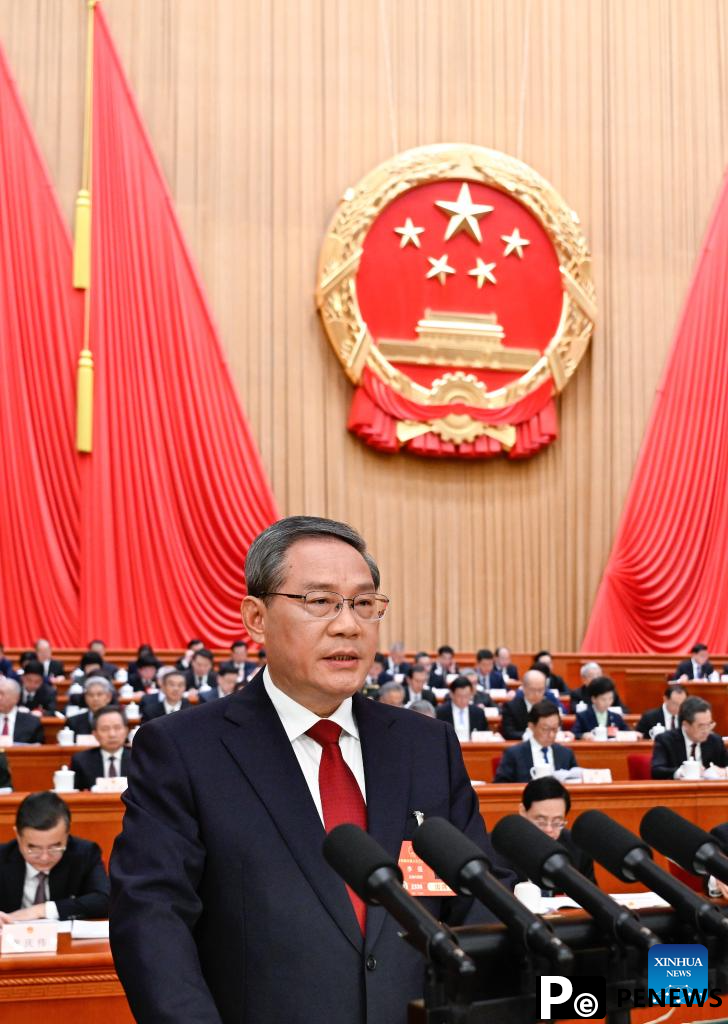 Chinese Premier Li Qiang delivers a government work report at the opening meeting of the third session of the 14th National People's Congress (NPC) at the Great Hall of the People in Beijing, capital of China, March 5, 2025. (Xinhua/Liu Bin)
